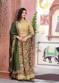 Olive Green & Mustard Bagru Hand Block Printed Full Flair Long Skirt With Top & Mulmul Dupatta